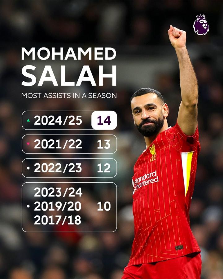24场14助,萨拉赫创个人单赛季英超助攻次数纪录ETChalmers @懂球帝2025-02-13 03:54英超第15轮补赛,利物浦客场对阵埃弗顿,萨拉赫上半场送出助攻,至此,萨拉赫本赛季英超已送出14次助攻,创个人英超单赛季最佳纪录。此役客场对阵埃弗顿,萨拉赫在比赛第16分钟传中助攻麦卡利斯特头球破门,帮助利物浦扳平比分。至此,萨拉赫本赛季英超24次出场已送出14次助攻,创下个人单赛季英超助攻次数纪录,打破他在2021-22赛季创下的13次助攻纪录。展开更多