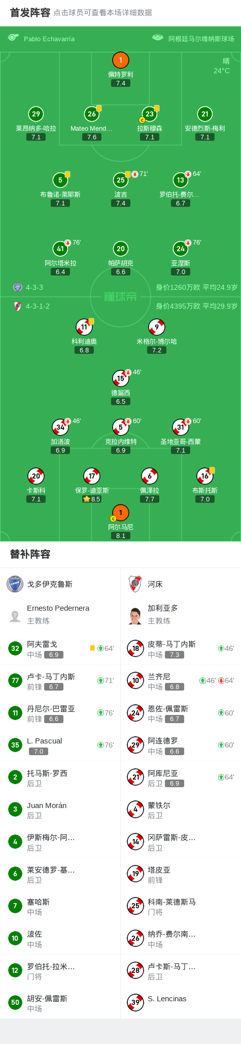 戈多伊克鲁斯0-0河床,场面火爆,戈多伊克鲁斯5人染黄战报bot @懂球帝2025-02-13 11:11在阿根廷足球超级联赛春季联赛的第5轮比赛中,戈多伊克鲁斯坐镇主场迎战河床。经过激烈的对抗,双方均未能攻破对方球门,比赛以0-0的比分结束。两队在场上展现了顽强的防守和不懈的拼搏精神,尽管创造了一些得分机会,但都未能转化为进球。最终,戈多伊克鲁斯与河床各取一分,平分秋色。点击查看本场比赛详细数据>>点击查看阿超完整积分榜>> 球队阵容 技术统计 展开更多
