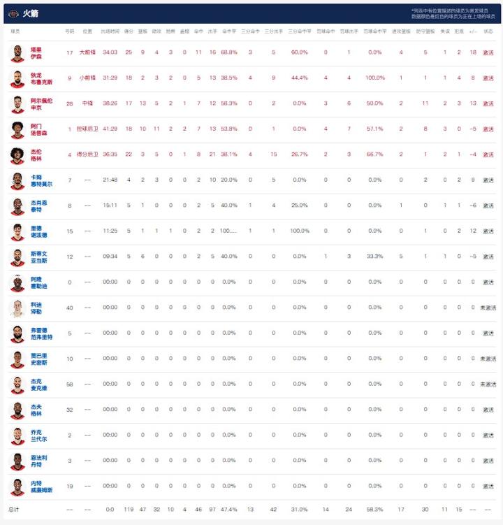 休斯顿火箭伊森25分9板4助,杰伦-格林22分3板5助,阿门18分10板11助,申京17分13板5助;