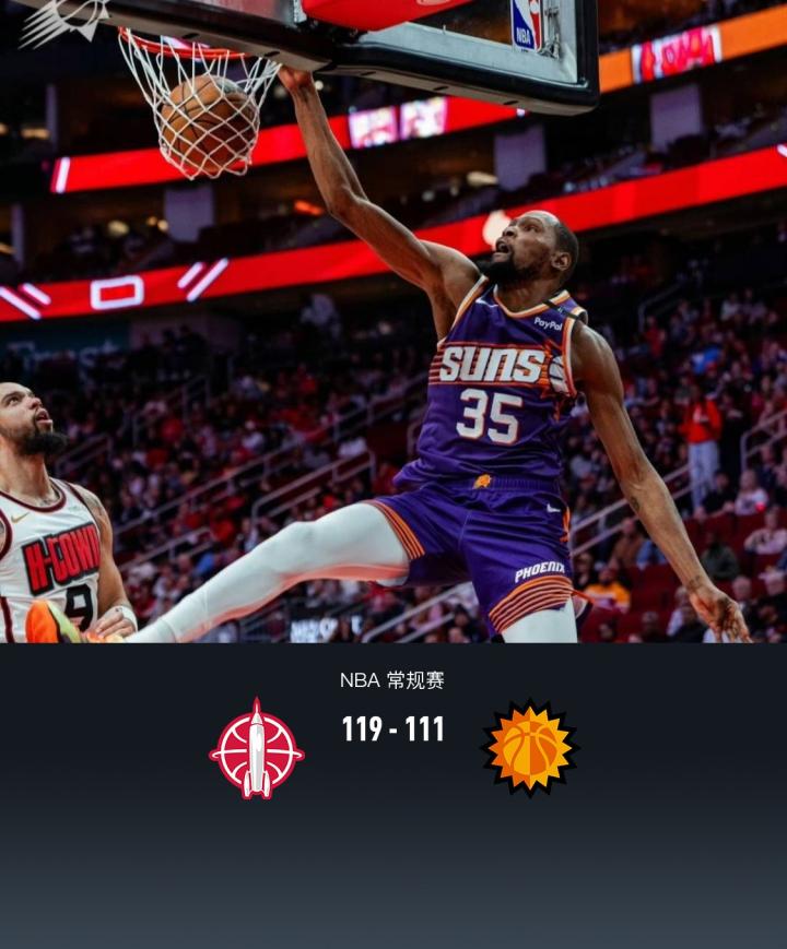 火箭119-111太阳,阿门18+10+11,杜兰特空砍37+9
