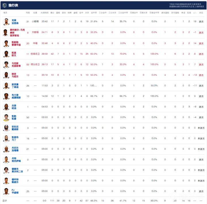 达拉斯独行侠欧文42分7板,克莱-汤普森17分7板2助,克里斯蒂17分5板4助,布兰德-威廉姆斯12分;