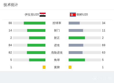 北京时间2月13日下午15:00,U20亚洲杯小组赛B组第一轮,伊拉克U20对阵朝鲜U20。上半场,贾费尔助攻艾曼-卢埃打破僵局,Kuk Choe劲射中柱。下半场,穆斯塔法-卡比勒推射造险,替补登场的Jin-song Kim扳平比分。最终,U20伊拉克1-1朝鲜U20。
