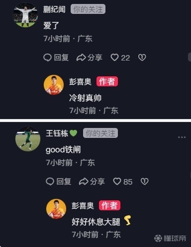 在评论区,队友蒯纪闻留言互动:“爱了。”彭啸回复:“冷射真帅。”队友王钰栋留言:“good铁闸。”彭喜奥回复:“好好休息大腿。”