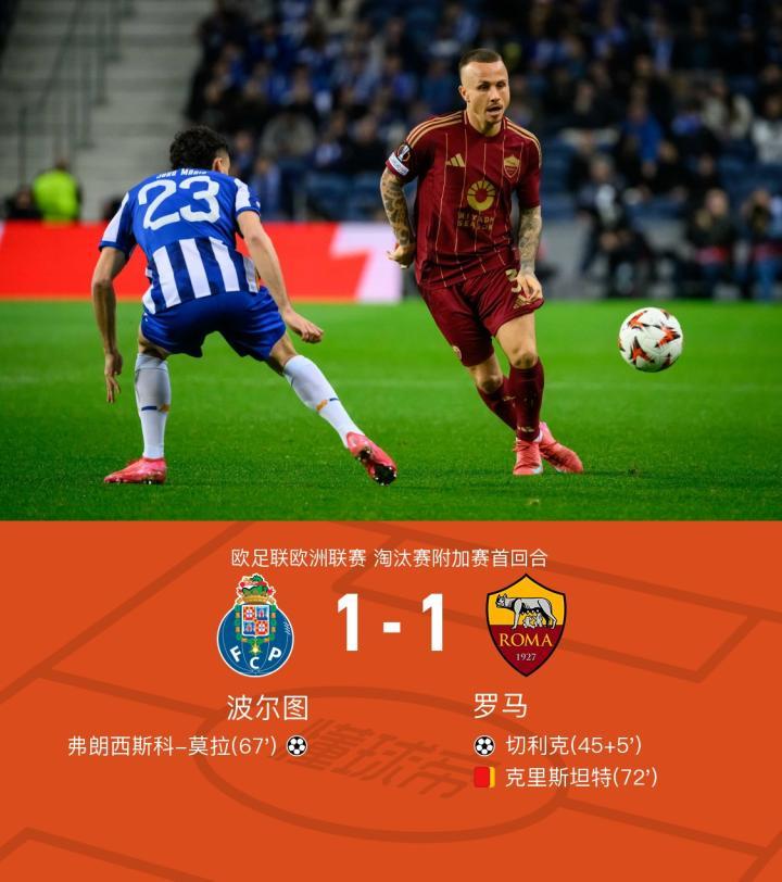 在欧足联欧洲联赛淘汰赛附加赛首回合的较量中,波尔图与罗马展开了一场激烈的对决。比赛上半场迪巴拉被阿兰-巴雷拉踢倒出现受伤,被动下场,切利克禁区跟进一脚捅射率先拔得头筹,下半场弗朗西斯科-莫拉外围跟进抽射将比分扳平,克里斯坦特拉拽犯规,两黄变一红被罚下,随后波尔图加强攻势但未能改写比分,全场战罢,最终双方以1-1的比分握手言和。