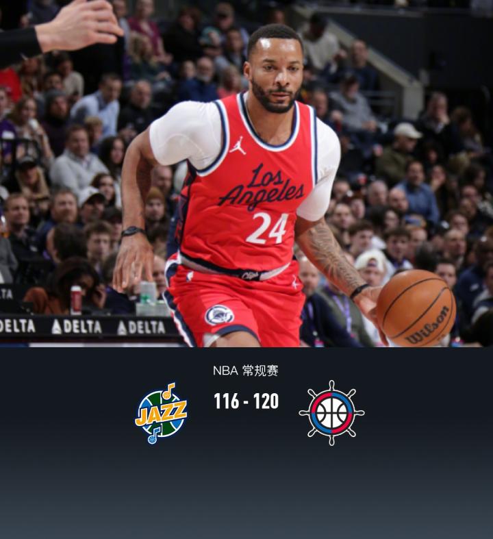 加时赛爵士马尔卡宁拿下2分,快船诺曼-鲍威尔拿下9分,最终爵士116-120不敌快船