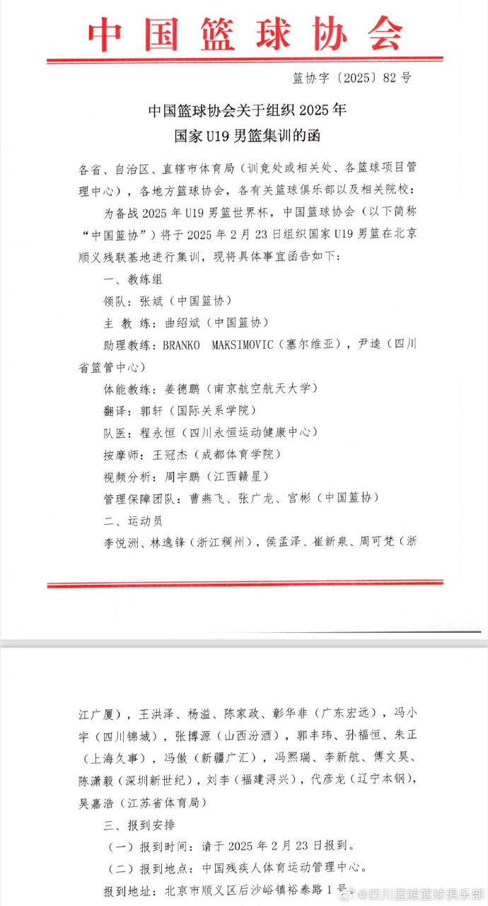 中国U19男篮此次集训将从2月23日开始。此次集训是为了备战将于今年6月28日-7月6日在瑞士洛桑举行的U19男篮世界杯,中国队与德国、斯洛文尼亚、加拿大同组。