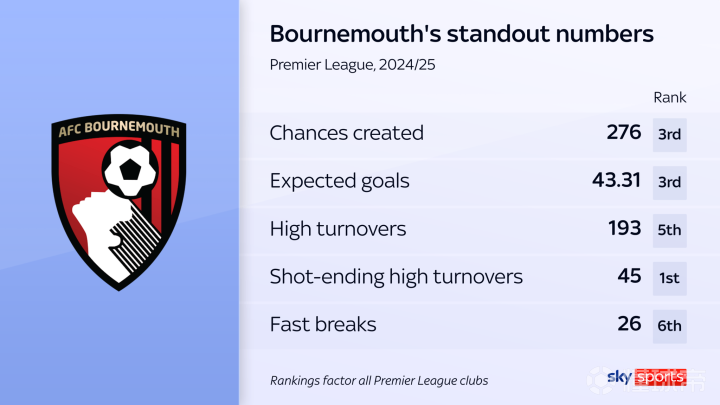 在本赛季的联赛中,伯恩茅斯有近七成比赛的预期进球数(xG)超过了对手,其中不乏对阵曼城、阿森纳和切尔西的恶战。他们的45次造成对方失误后射门,甚至连英超领头羊、“压迫狂魔”利物浦都望尘莫及。