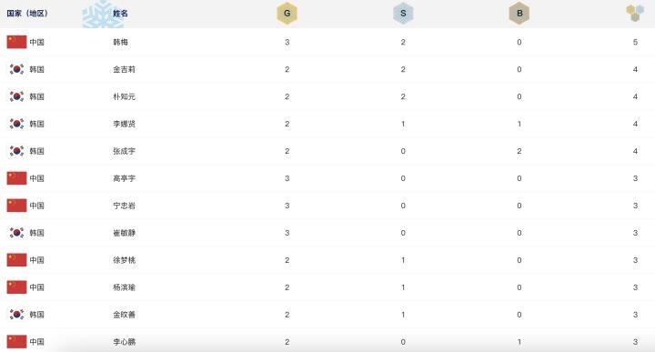 韩国的崔敏静拿到短道速滑女子500米、女子1000米、混合团体2000米接力3枚金牌。