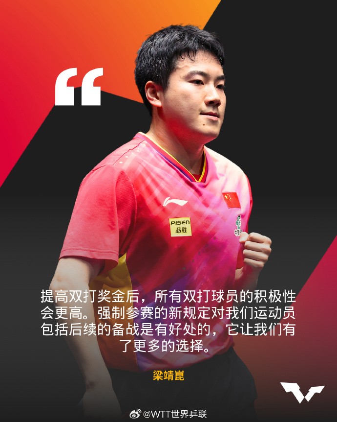 梁靖崑:“提高双打奖金后,所有双打球员的积极性会更高。强制参赛的新规定对我们运动员包括后续的备战是有好处的,它让我们有了更多的选择。”