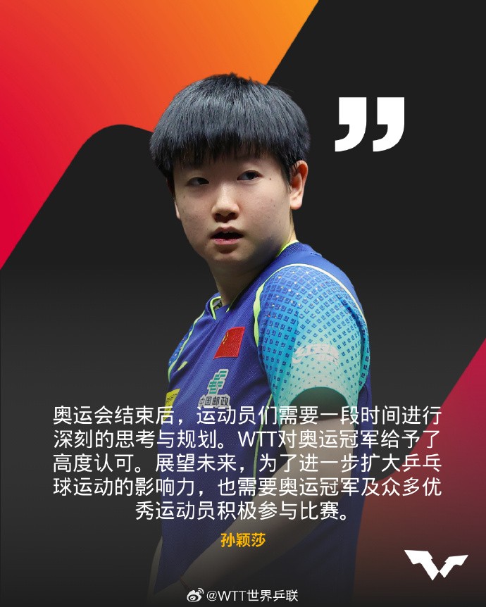 孙颖莎:“奥运会结束后,运动员们需要一段时间进行深刻的思考与规划。WTT对奥运冠军给予了高度认可。展望未来,为了进一步扩大乒乓球运动的影响力,也需要奥运冠军及众多优秀运动员积极参与比赛。”