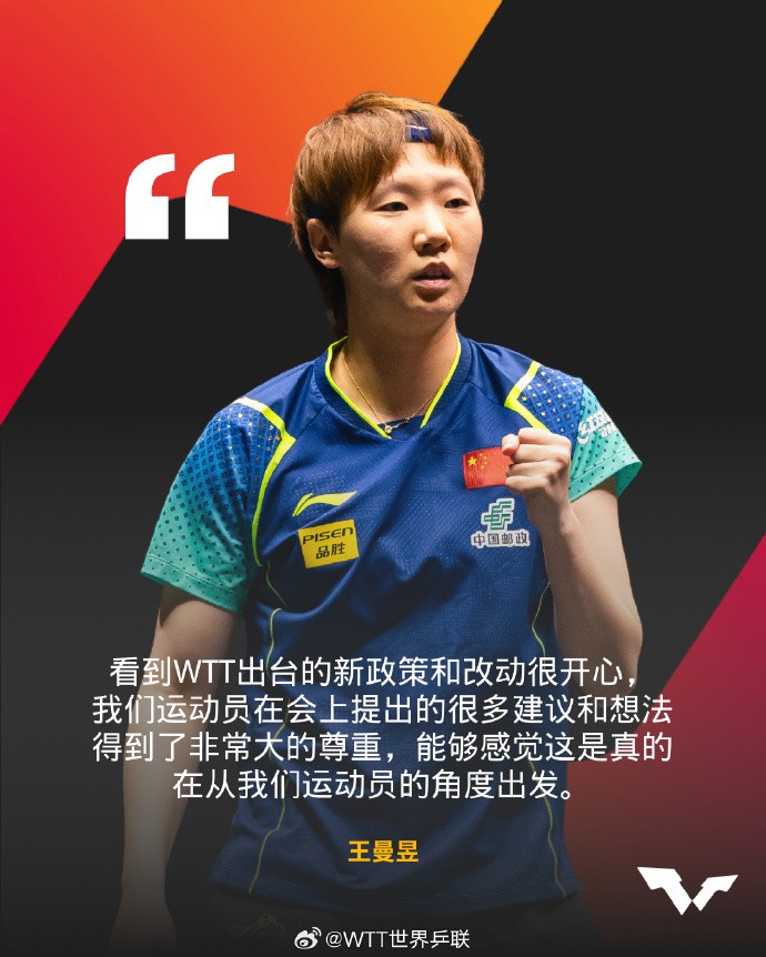 王曼昱:“看到WTT出台的新政策和改动很开心,我们运动员在会上提出的很多建议和想法得到了非常大的尊重,能够感觉这是真的在从我们运动员的角度出发。”