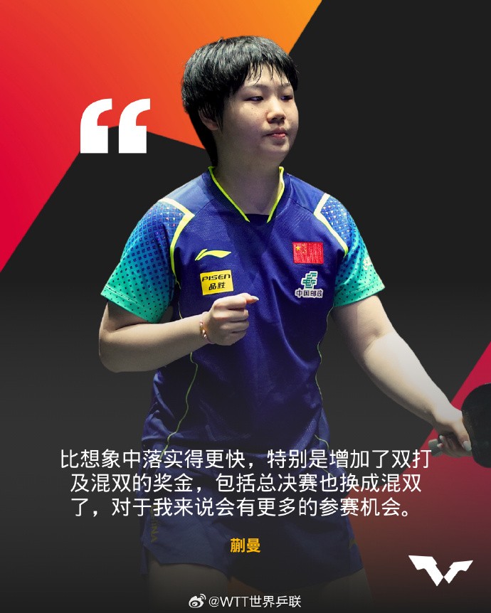 蒯曼:“比想象中落实得更快,特别是增加了双打及混双的奖金,包括总决赛也换成混双了,对于我来说会有更多的参赛机会。”