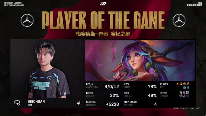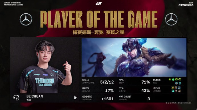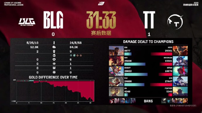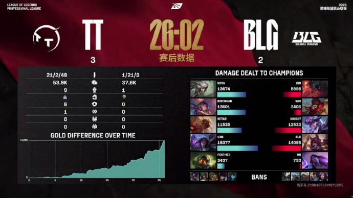 第25分钟,TT中路推进击杀BLG四人拆掉中路高地塔一波结束比赛,2-21。