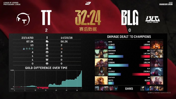 第32分钟,高地交战,TT击杀BLG下路组,Wei单杀Feather,TT直接推掉BLG水晶拿下赛点,14-23。