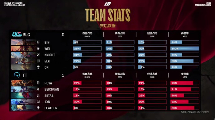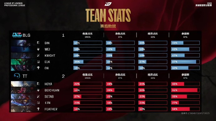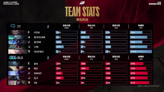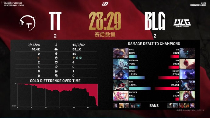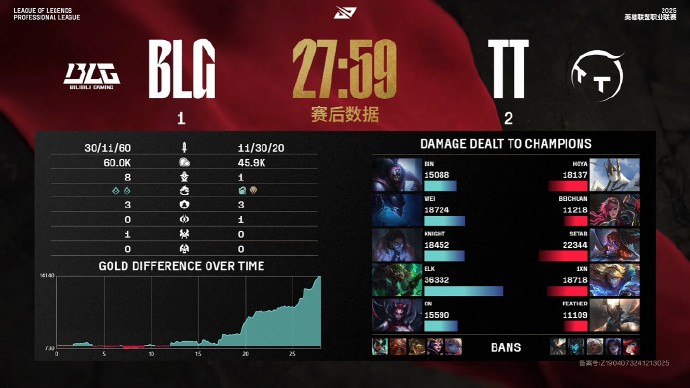 第19分钟,TT抢下先锋,但团战BLG打出0换5,Bin收获双杀,16-8。