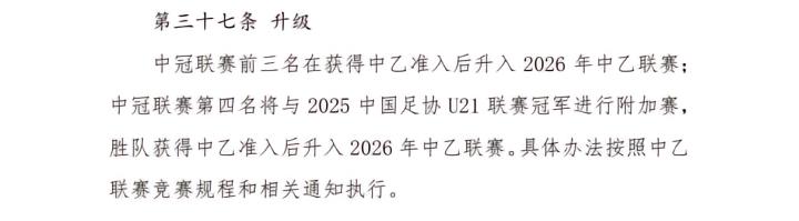 中冠联赛新规:3队直升,第4名将与U21冠军进行附加赛Aphelios19 @懂球帝2025-02-14 23:142月14日晚,足协发布了新赛季中冠升级规则,排名前3的队伍将直升中乙,而第4名将和U21联赛的冠军进行附加赛。新赛季中冠的大区赛将于3月开始。最大的变化是新赛季升乙名额为3.5个,即前三名升乙,第四名需和U21联赛冠军进行升乙附加赛。此前两个赛季,海港B队、泰山B队、三镇B队和成都B队都通过U21联赛直升中乙,而在本赛季,U21联赛的升乙名额锐减,冠军队伍想要升上中乙还需要进行附加赛的考验。展开更多