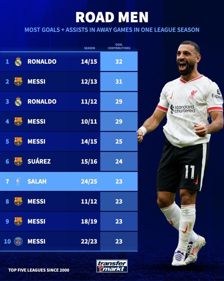 本世纪五大联赛单赛季客场参与进球排行:萨拉赫目前排名第七