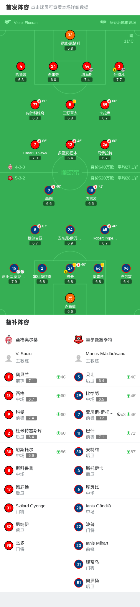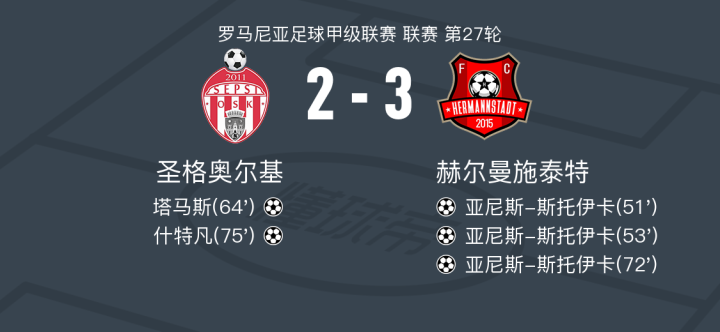 北京时间2月14日罗马尼亚足球甲级联赛 联赛 第27轮,圣格奥尔基主场对阵赫尔曼施泰特。圣格奥尔基塔马斯破门,什特凡破门。赫尔曼施泰特亚尼斯-斯托伊卡帽子戏法。最终比分圣格奥尔基 2-3 赫尔曼施泰特。