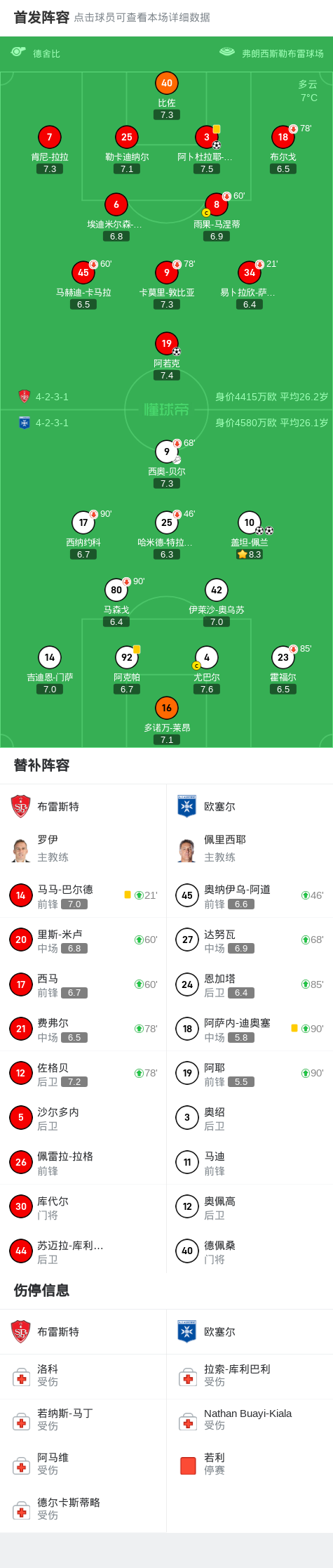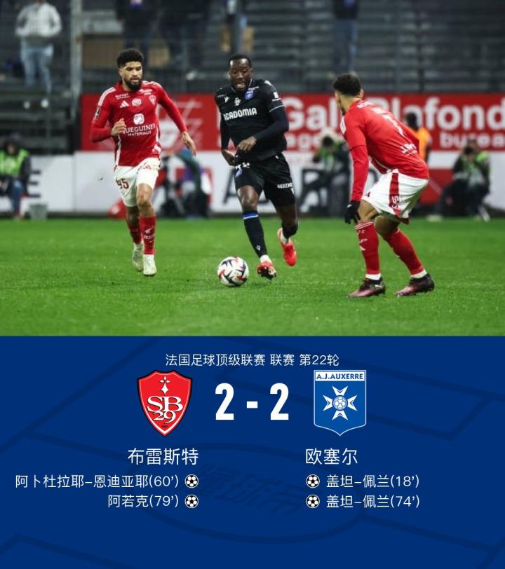 北京时间2月15日法国足球顶级联赛 联赛 第22轮,布雷斯特主场对阵欧塞尔。布雷斯特阿卜杜拉耶-恩迪亚耶破门,阿若克破门。欧塞尔盖坦-佩兰梅开二度。最终比分布雷斯特 2-2 欧塞尔。