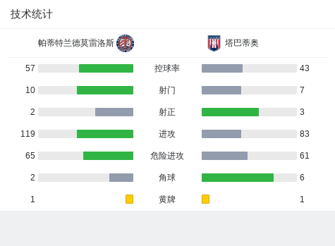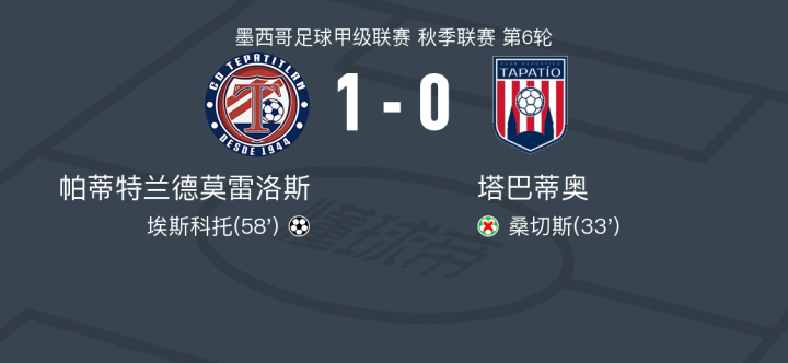 北京时间2月15日墨西哥足球甲级联赛 秋季联赛 第6轮,帕蒂特兰德莫雷洛斯主场对阵塔巴蒂奥。帕蒂特兰德莫雷洛斯埃斯科托破门。最终比分帕蒂特兰德莫雷洛斯 1-0 塔巴蒂奥。