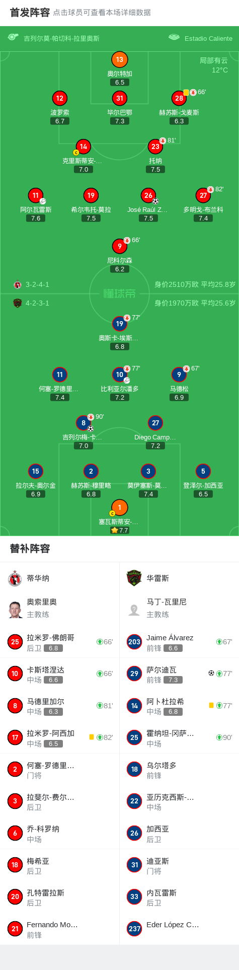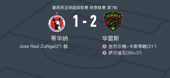 北京时间2月15日墨西哥足球超级联赛 秋季联赛 第7轮,蒂华纳主场对阵华雷斯。蒂华纳José Raúl Zúñiga破门。华雷斯吉列尔梅-卡斯蒂略破门,萨尔迪瓦破门。最终比分蒂华纳 1-2 华雷斯。