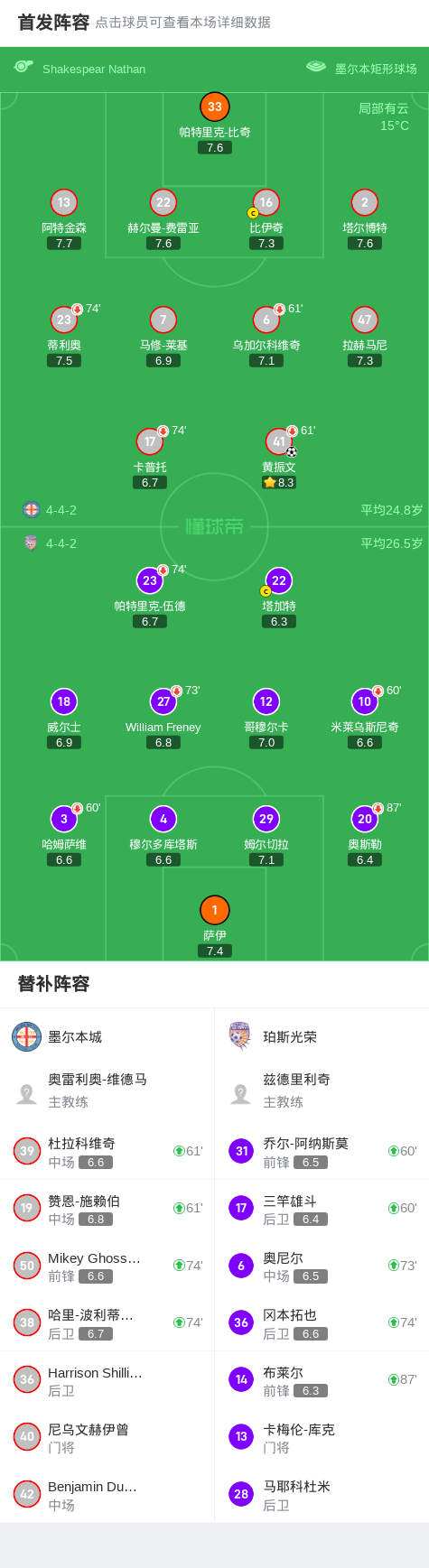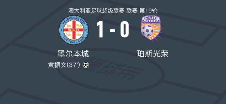 墨尔本城1-0珀斯光荣,华裔小将黄振文打进全场唯一进球战报bot @懂球帝2025-02-15 15:54北京时间2月15日澳大利亚足球超级联赛 联赛 第19轮,墨尔本城主场对阵珀斯光荣。墨尔本城华裔小将黄振文完成破门为球队攻入制胜球。最终比分墨尔本城 1-0 珀斯光荣。点击查看本场比赛详细数据>>点击查看澳超完整积分榜>>精彩瞬间第37分钟,墨尔本城球员黄振文打入一球。 球队阵容 技术统计 展开更多