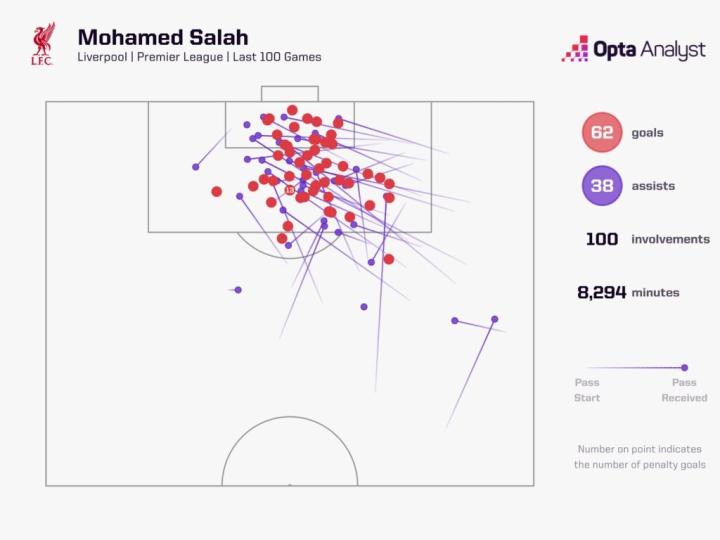 在与埃弗顿的比赛中奉献一球一助后,萨拉赫最近100场英超比赛直接参与了100球,他成为第四位在100场英超比赛周期里直接参与至少100球的球员。