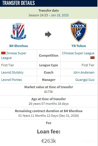 德转显示,云南玉昆租借上海申花门将马镇花费26.3万欧元,约合人民币200万元。