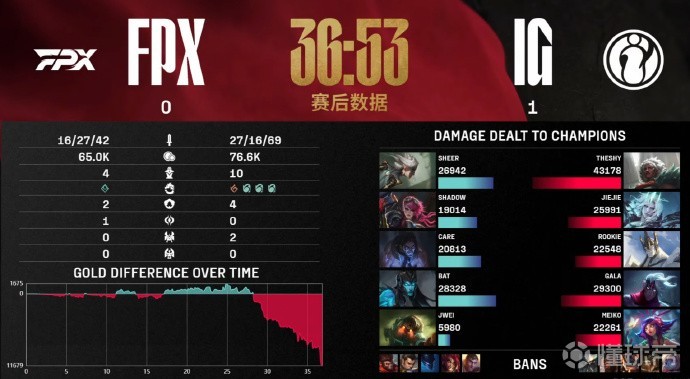 第36分钟,高地团战,IG打出0换5拆掉FPX基地拿下首局,IG锁定出线名额,16-27。