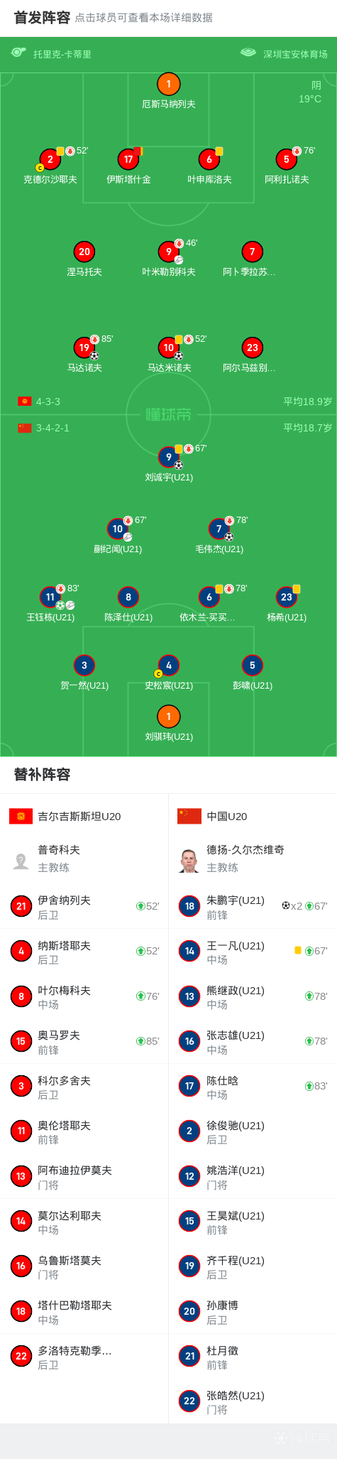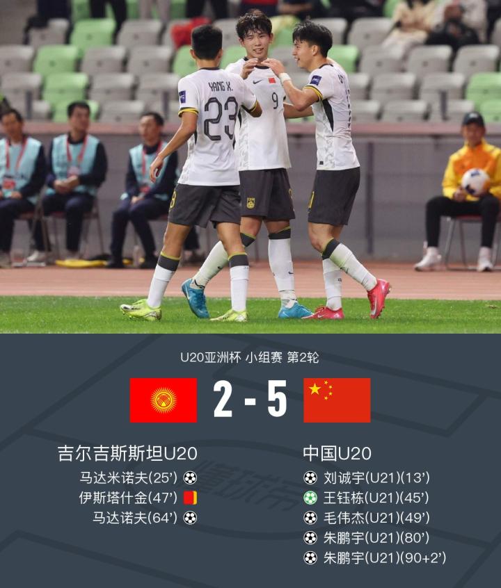 北京时间2月15日U20亚洲杯 小组赛 第2轮,吉尔吉斯斯坦U20对阵中国U20。上半场王钰栋助攻刘诚宇连场破门,马达米诺夫世界波扳平,王钰栋点射得分,下半场伊斯塔什金两黄变一红被罚下,毛伟杰头球扩大比分,马达诺夫扳回一球,朱鹏宇单刀破门,补时阶段朱鹏宇头球梅开二度。最终比分中国U20 5-2 大胜吉尔吉斯斯坦U20,提前小组出线 。