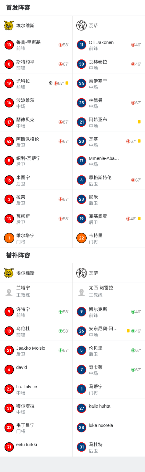 埃尔维斯1-0瓦萨,尤科拉助球队取胜战报bot @懂球帝2025-02-15 22:36北京时间2月15日芬兰联赛杯 小组赛,埃尔维斯对阵瓦萨。埃尔维斯尤科拉破门。最终比分埃尔维斯 1-0 瓦萨。点击查看本场比赛详细数据>>精彩瞬间第55分钟,埃尔维斯球员瓦柳斯助攻尤科拉打入一球。 球队阵容 技术统计 展开更多