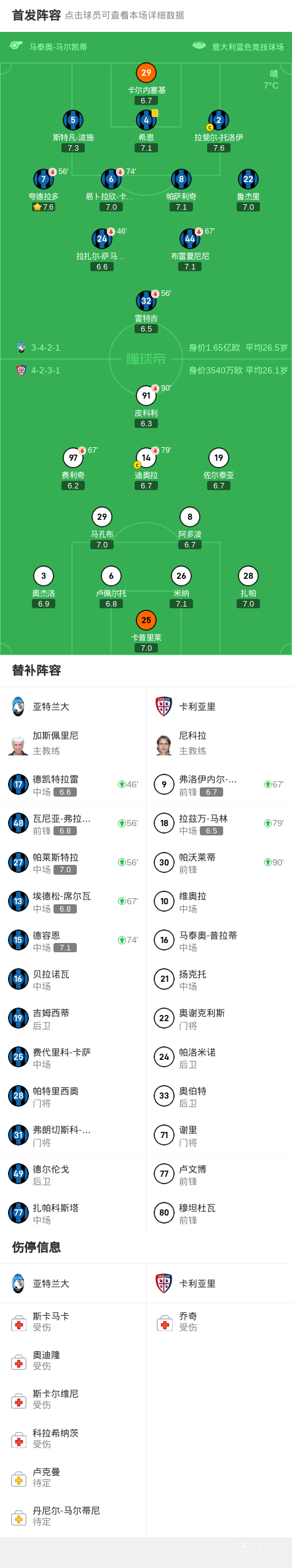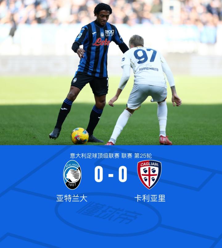 北京时间2月15日意甲联赛第25轮,亚特兰大主场对阵卡利亚里。布雷夏尼尼进球被吹无效,奥杰洛禁区内手球嫌疑未被判罚点球,比赛尾声阶段,瓦尼亚-弗拉霍维奇和帕萨利奇射门先后造险,最终亚特兰大 0-0战平卡利亚里。