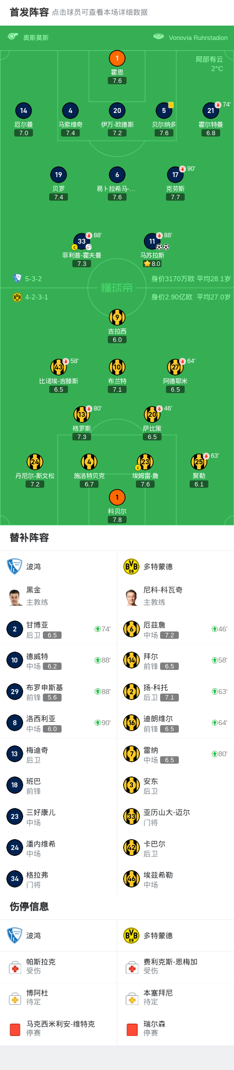 第33分钟,第33分钟,霍夫曼推射远角,马苏拉斯铲射将球补进,多特客场0-1落后波鸿