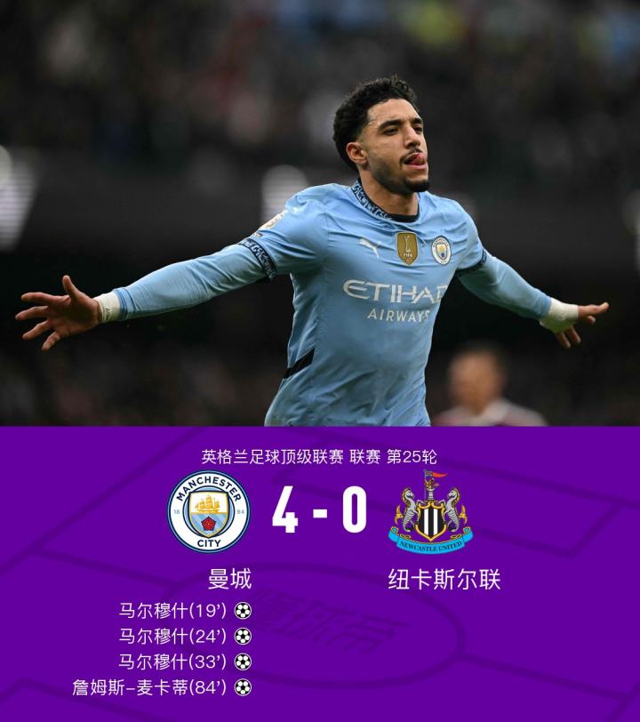 剑南春|曼城4-0大胜纽卡,马尔穆什戴帽,哈兰德送助攻+伤退