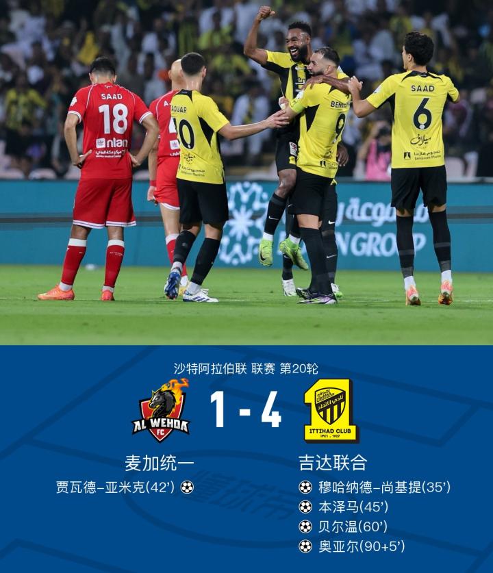 吉达联合客场4-1麦加统一4分优势领跑,本泽马两传一射