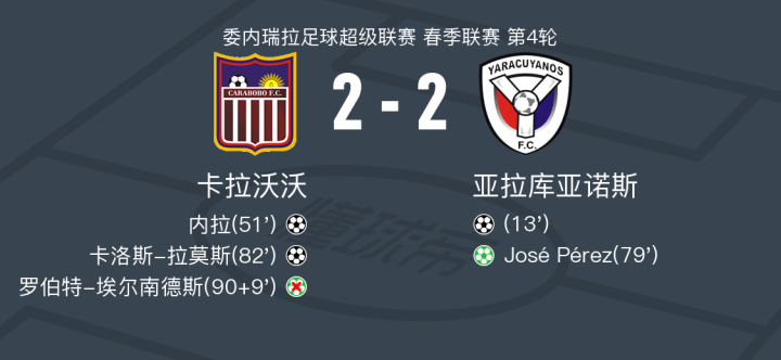 北京时间2月16日委内瑞拉足球超级联赛 春季联赛 第4轮,卡拉沃沃主场对阵亚拉库亚诺斯。卡拉沃沃内拉破门,卡洛斯-拉莫斯破门。亚拉库亚诺斯José Pérez破门。最终比分卡拉沃沃 2-2 亚拉库亚诺斯。