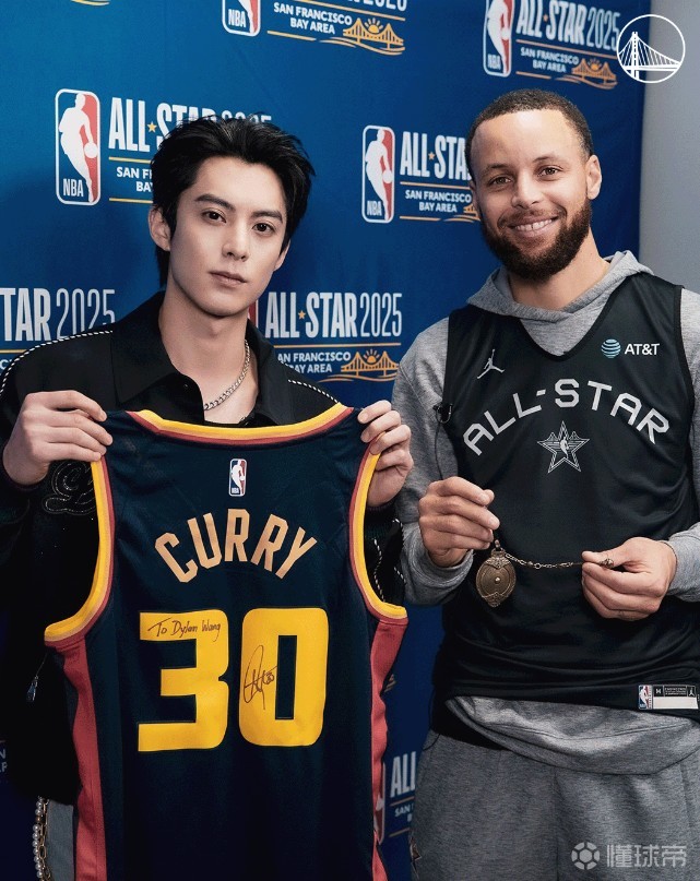 勇士发布这张照片并配文道:传奇联动,王鹤棣 x 库里(Legendary link-up! Dylan Wang x SC30)