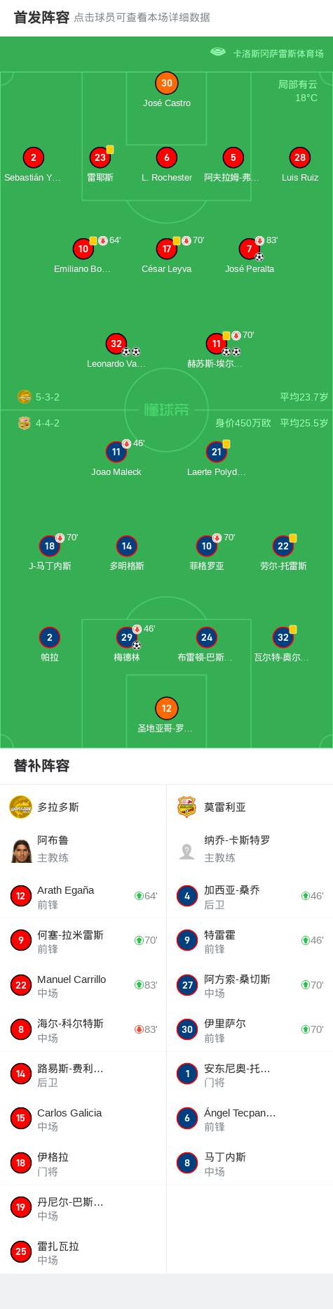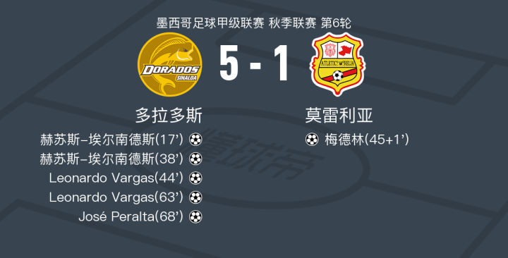北京时间2月16日墨西哥足球甲级联赛 秋季联赛 第6轮,多拉多斯主场对阵莫雷利亚。多拉多斯赫苏斯-埃尔南德斯梅开二度,Leonardo Vargas梅开二度,José Peralta破门。莫雷利亚梅德林破门。最终比分多拉多斯 5-1 莫雷利亚。
