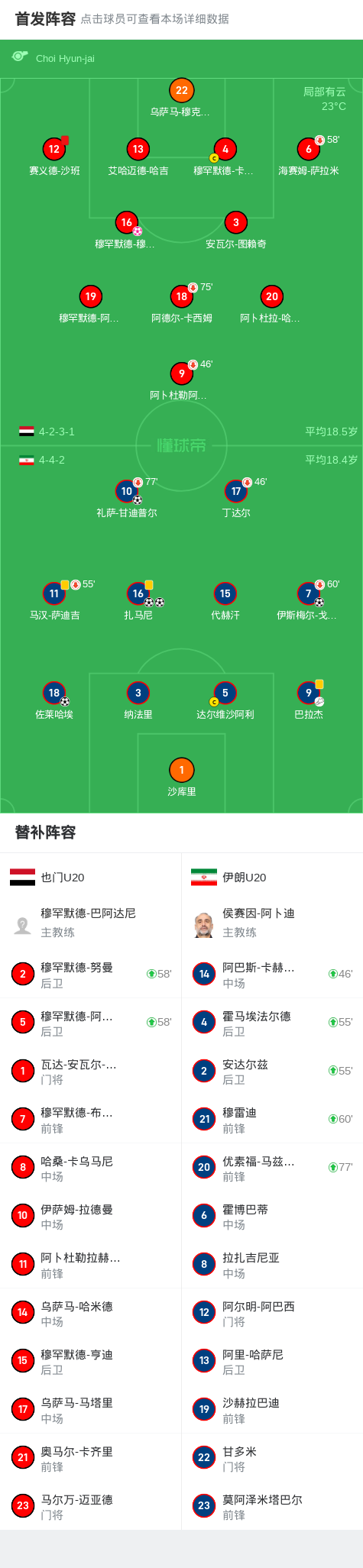 北京时间2月16日U20亚洲杯 小组赛 第2轮,也门U20对阵伊朗U20。也门U20穆罕默德-穆克比勒自摆乌龙。伊朗U20扎马尼梅开二度,伊斯梅尔-戈利扎德破门,礼萨-甘迪普尔破门,佐莱哈埃破门。最终比分也门U20 0-6 伊朗U20。