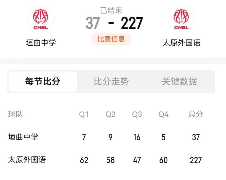 而仅过了一天,太原外国语学校就以227分的夸张得分刷新了这一纪录。四节比分分别为62-7、58-9、47-16、60-5。