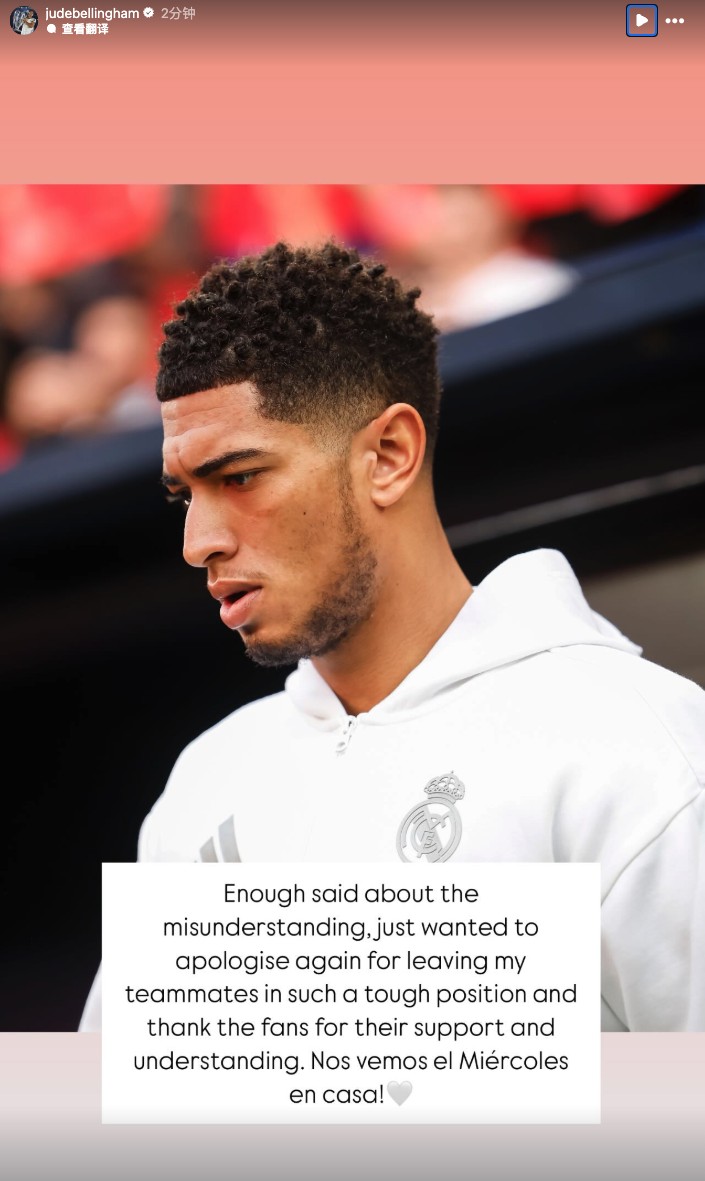 今日,贝林厄姆更新社交媒体,写道:“关于误解不再多说了,只想再次为让我的队友们处于如此艰难的境地而道歉,并感谢球迷们的支持和理解。周三在主场见!”