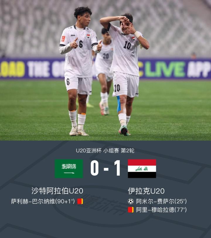 北京时间2月16日U20亚洲杯 小组赛 第2轮,沙特阿拉伯U20对阵伊拉克U20。伊拉克U20阿米尔-费萨尔破门。阿里-穆哈拉德和萨利赫-巴尔纳维两黄变一红被罚下。最终比分沙特阿拉伯U20 0-1 伊拉克U20。