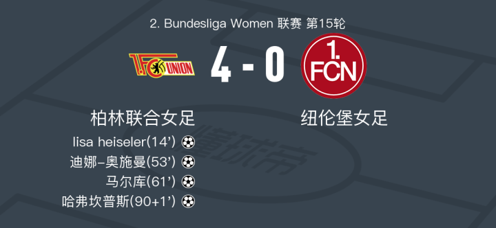 北京时间2月16日2. Bundesliga Women 联赛 第15轮,柏林联合女足主场对阵纽伦堡女足。柏林联合女足lisa heiseler破门,迪娜-奥施曼破门,马尔库破门,哈弗坎普斯破门。最终比分柏林联合女足 4-0 纽伦堡女足。