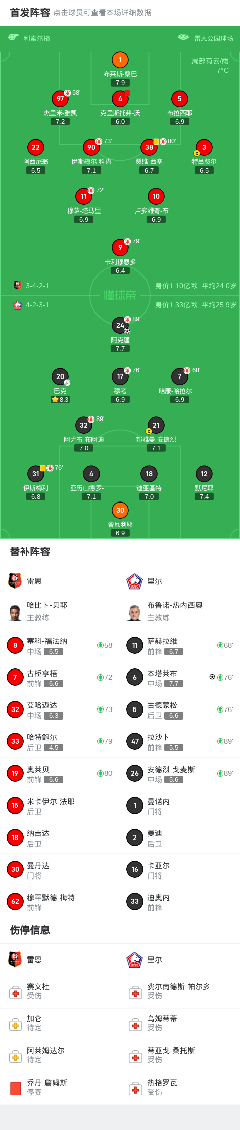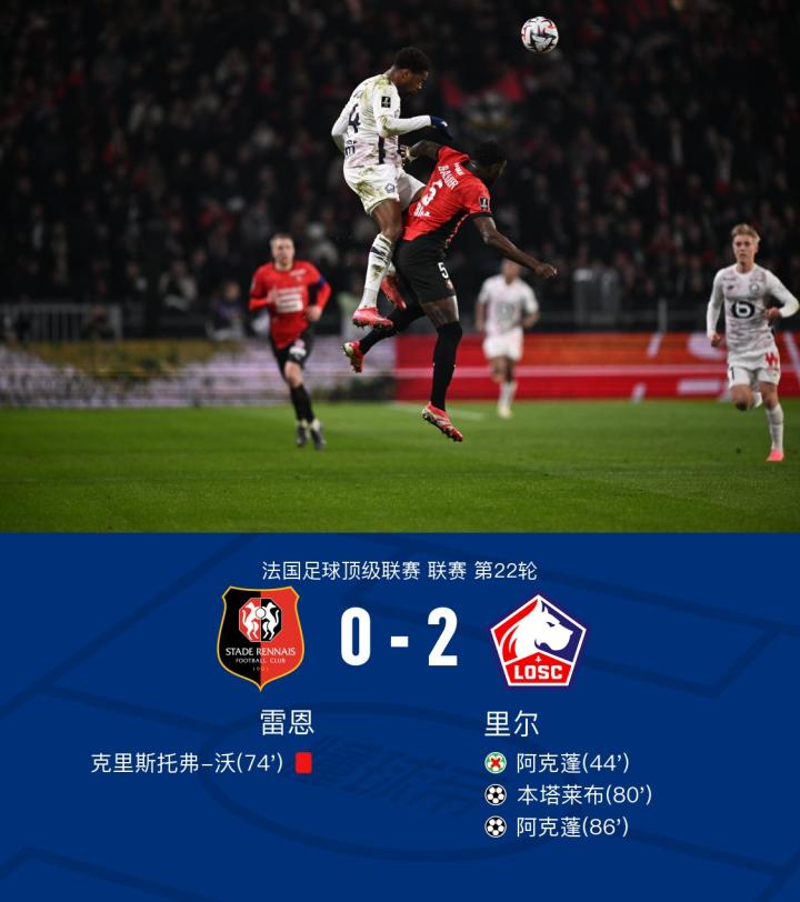 北京时间2月17日法国足球顶级联赛 联赛 第22轮,雷恩主场对阵里尔。里尔本塔莱布破门,阿克蓬破门。最终比分雷恩 0-2 里尔。