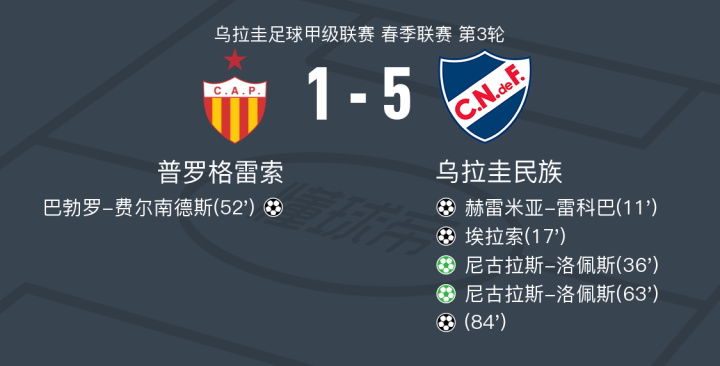 北京时间2月17日乌拉圭足球甲级联赛 春季联赛 第3轮,普罗格雷索主场对阵乌拉圭民族。普罗格雷索巴勃罗-费尔南德斯破门。乌拉圭民族赫雷米亚-雷科巴破门,埃拉索破门,尼古拉斯-洛佩斯梅开二度。最终比分普罗格雷索 1-5 乌拉圭民族。