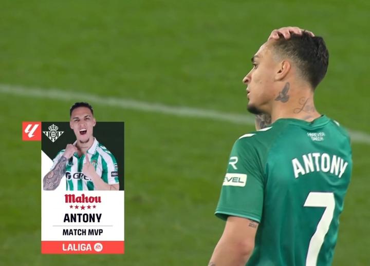 强无敌!安东尼连续三轮西甲当选全场最佳球员
