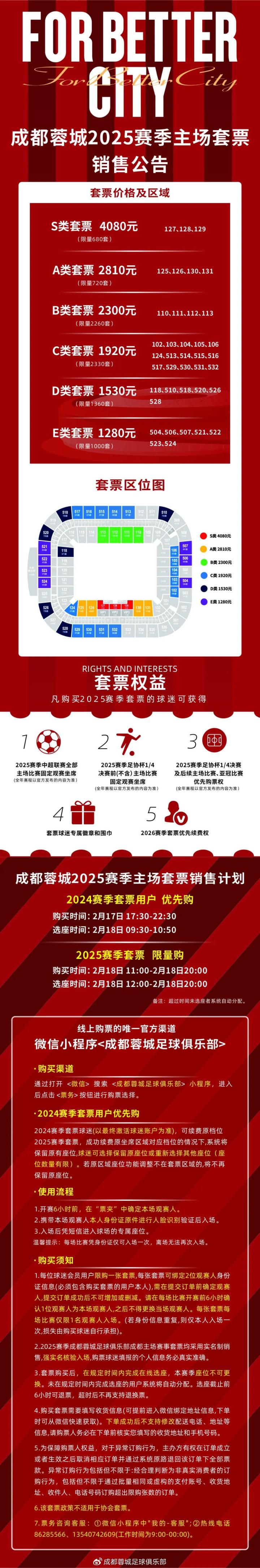 伴随着2025赛季新征程的号角,成都蓉城主场套票也将火热开售。无论您是铁杆球迷,还是新加入的成都蓉城家人,抓住购票机会,让我们共同成为成都蓉城2025赛季的“蓉”耀一员!