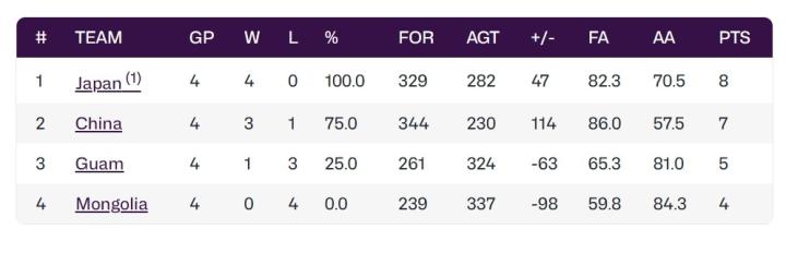 目前中国男篮取得3胜1负的战绩,积7分排名小组第二。由于在上一轮的比赛中以101-53的比分大胜关岛队,所以如果在下一场比赛击败日本,就锁定小组出线名额。如果本场比赛落败,则需要在下一场对阵关岛的比赛中确保获胜。