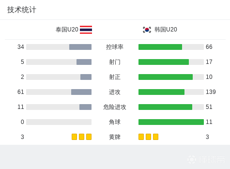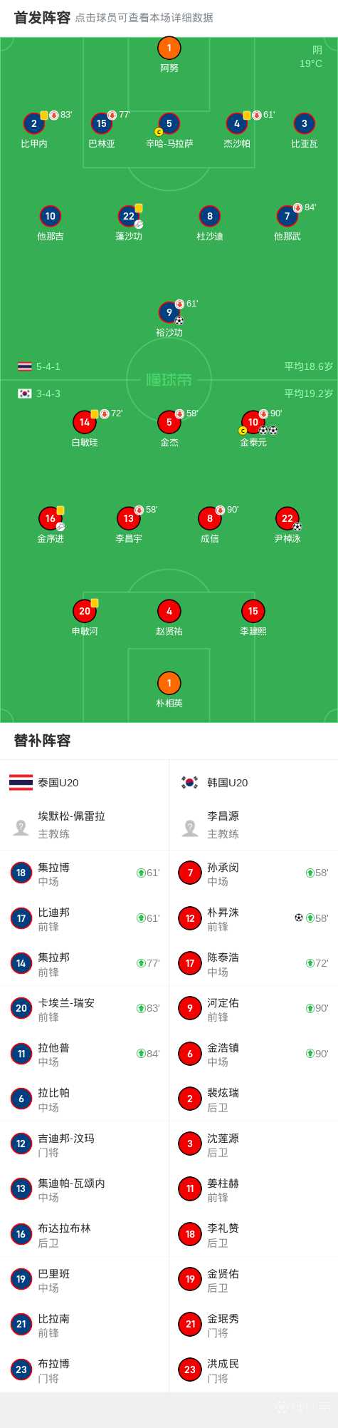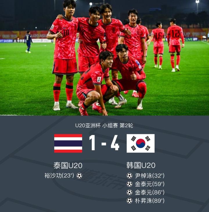 北京时间2月17日U20亚洲杯小组赛第2轮,泰国U20对阵韩国U20。泰国队裕沙功率先破门,随后韩国队尹棹泳乱战中抓住机会扳平。下半场,金泰元头球梅开二度,朴昇洙传射建功。最终比分泰国U20 1-4 韩国U20,韩国U20二连胜提前出线。