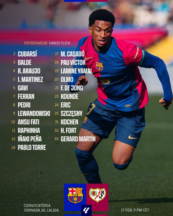 巴塞罗那公布对阵巴列卡诺大名单,阿劳霍、法蒂在列,费尔明-洛佩斯停赛。
